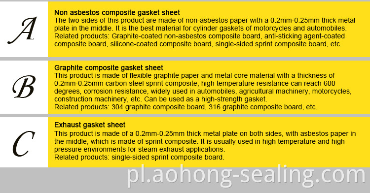 Głównie złożone przez papierze beattera i arkusz metalowy. Jest to najlepszy materiał uszczelki głowicy cylindrów. Służy do maszyn sprzętu, takiego jak silnik samochodowy, silnik motocyklowy, silnik spalania wewnętrznego Diesla itp.